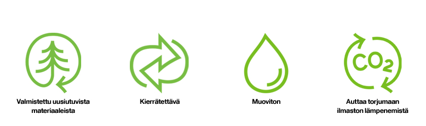 Ympäristöystävälliset, kierrätettävät PureFiber™-tuotteet valmistetaan uusiutuvista materiaaleista. Kuten nimikin kertoo, ne eivät sisällä lainkaan muovia.